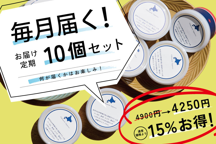 季節のジェラートセットが一般販売よりいち早く、そしてお得に届く10個セットです。旬の味をお届けする季節のセット年に4回届きます。いつでも解約自由ですのでお気軽にお申込みいただけます。
